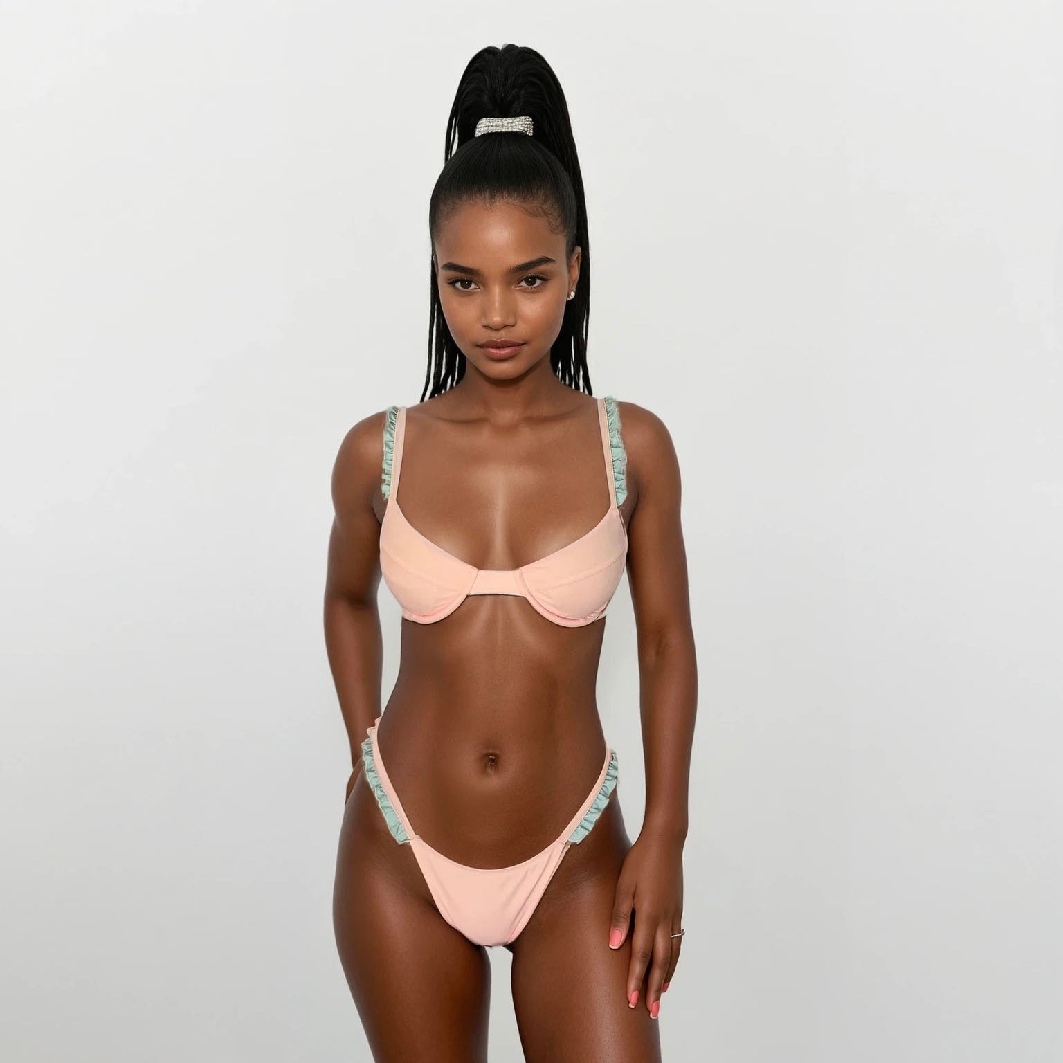Das Model ist 164 cm und trägt Größe S. Das Bikini Oberteil fällt klein aus.