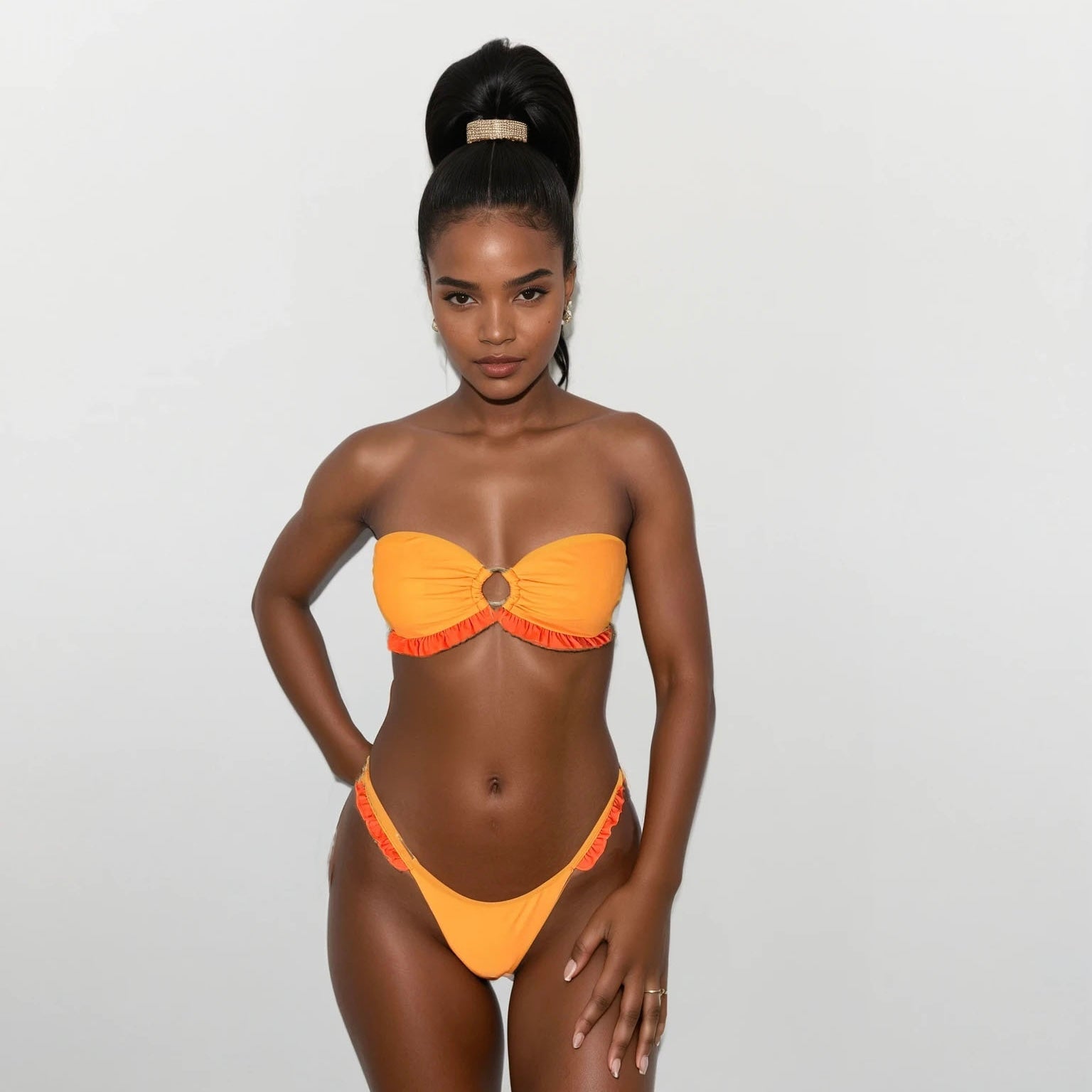 Das Model ist 164 cm und trägt Größe S. Das Bikini Oberteil fällt klein aus.