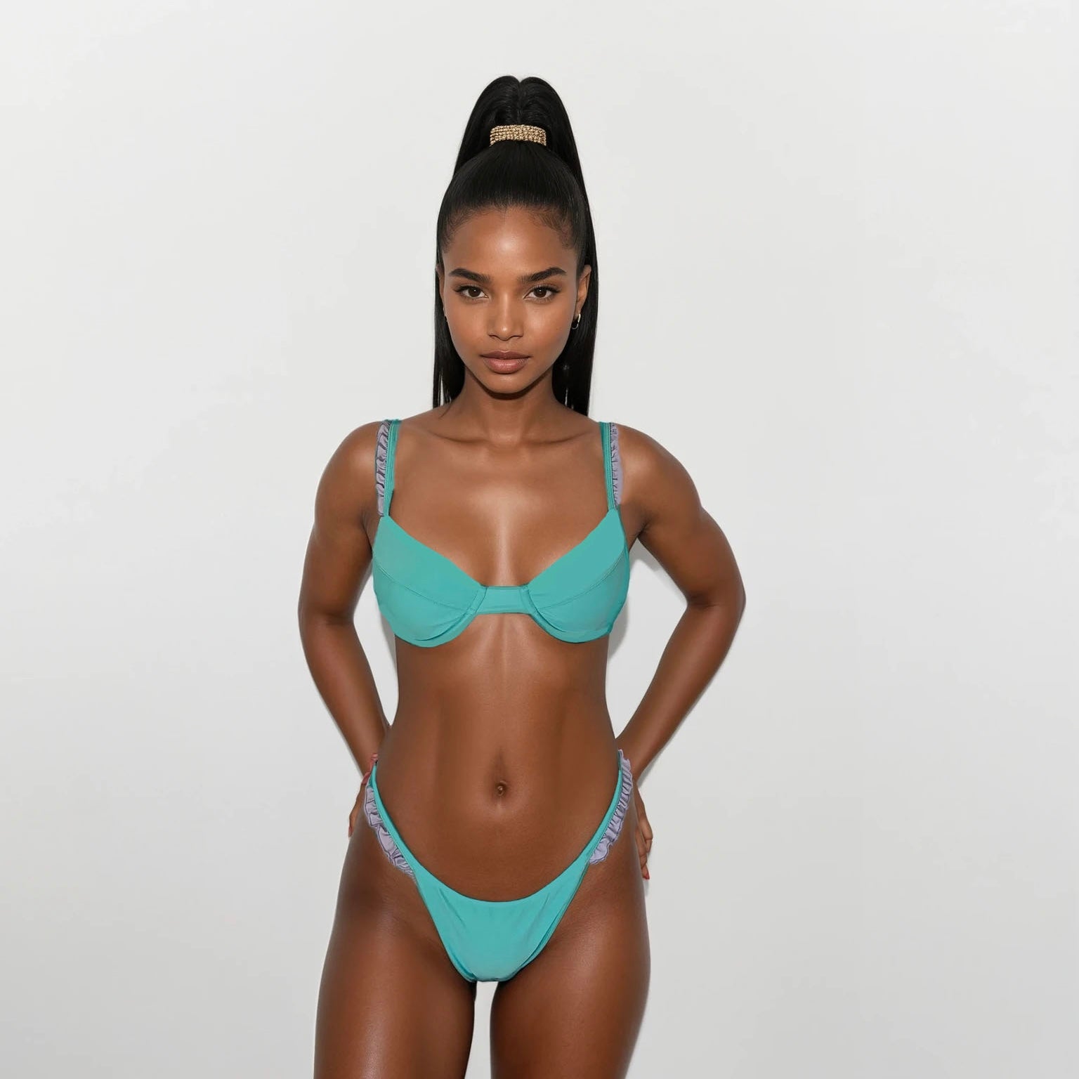Das Model ist 164 cm und trägt Größe S. Das Bikini Oberteil fällt klein aus.
